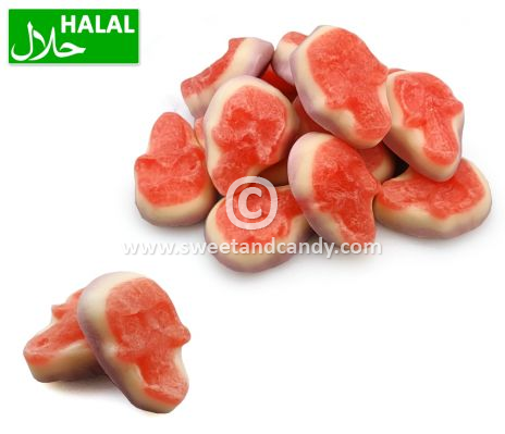 druivensuiker, siroop, suiker, water, runder halal gelatine, gemodificeerd aardappelzetmeel, zuurteregelaar (E296, E330), coatingsmiddel (plantaardige olie (palm), E901, E903), kunstmatige aroma, kleurstoffen (E133, E129).