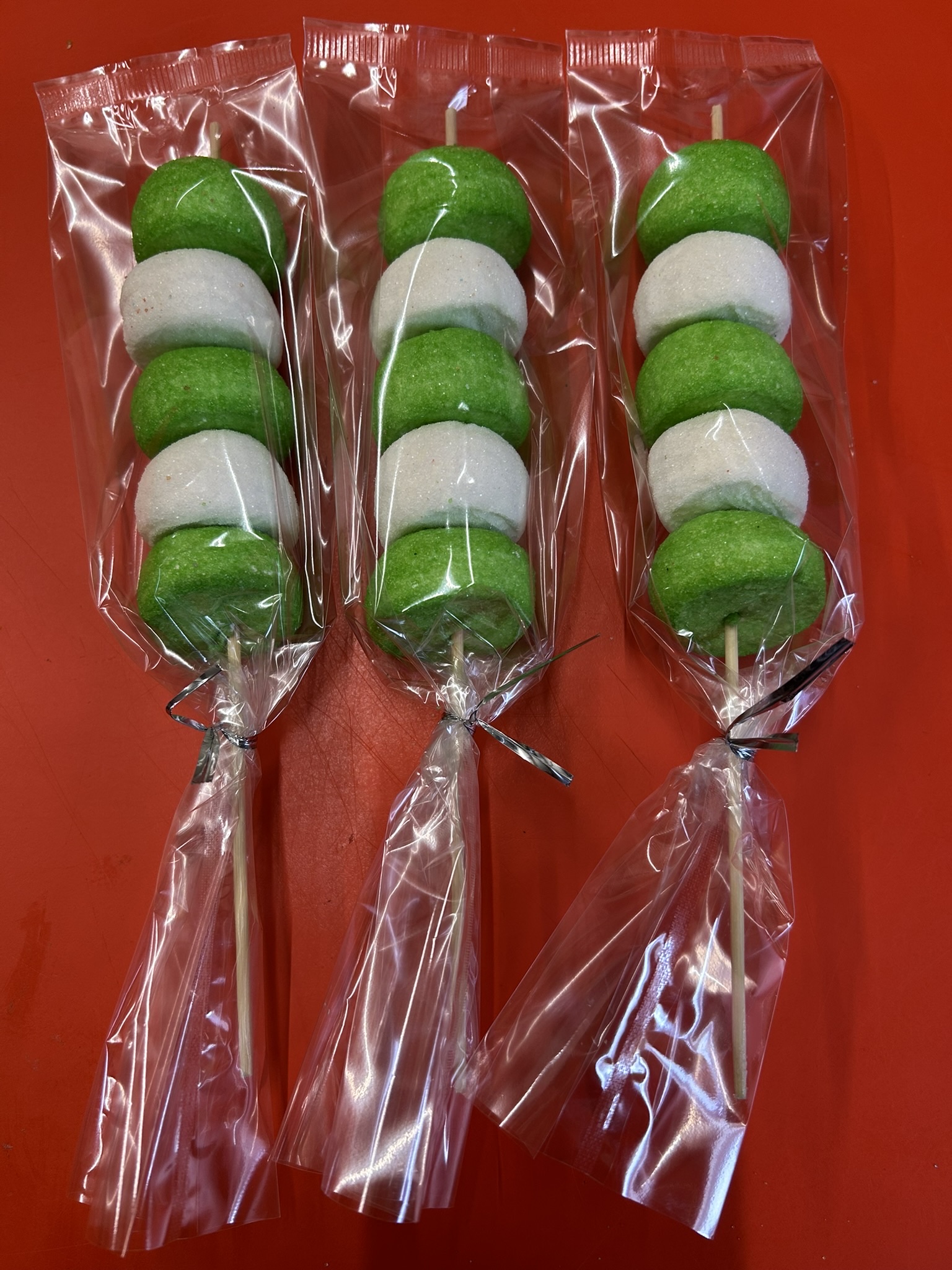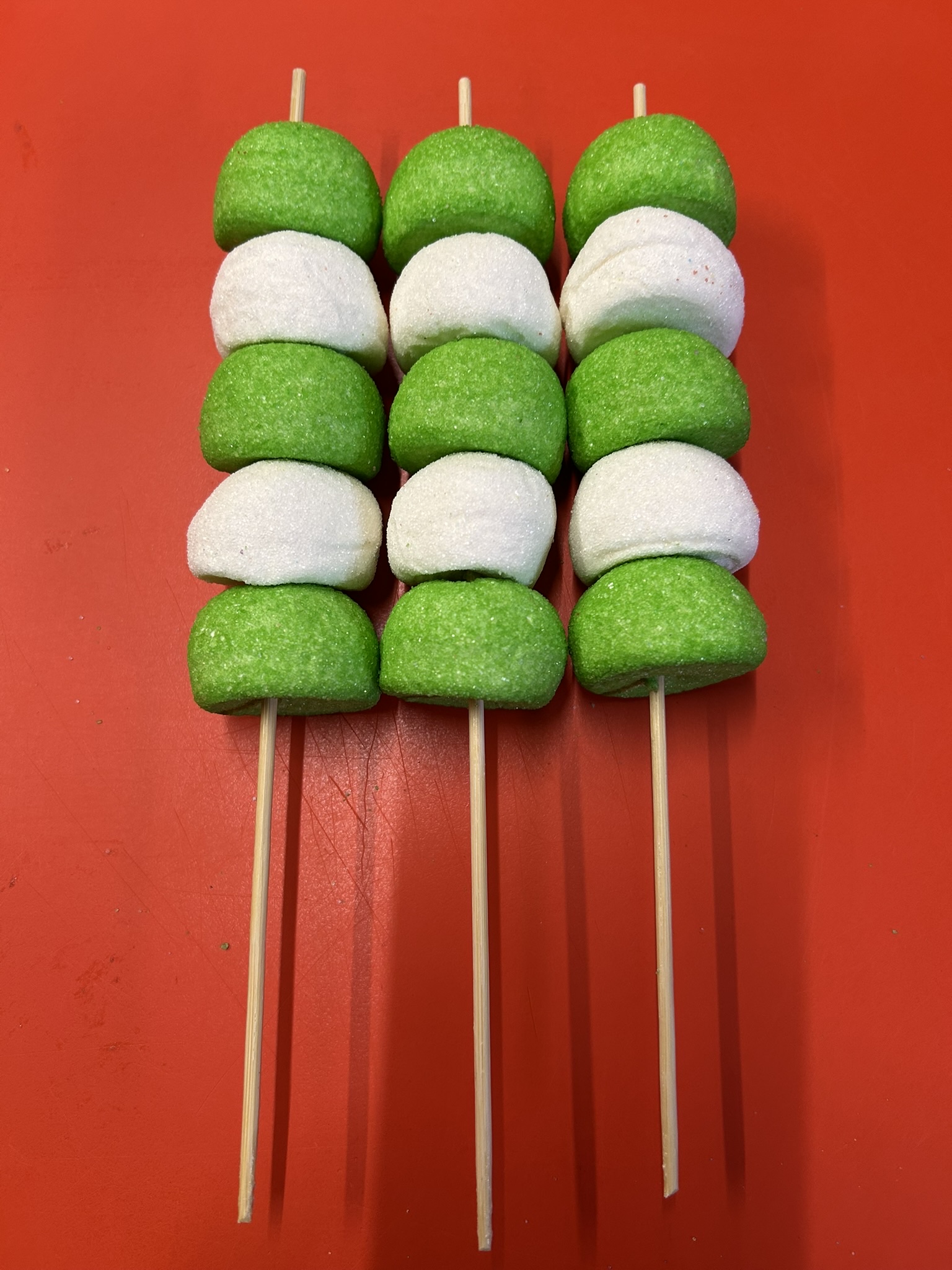 De traktatie bestaat uit 5 spekbollen in de kleuren Groen en Wit.