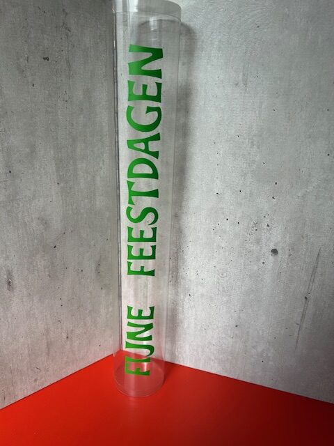 Een Lege snoepkoker met daarop de tekst ‘Fijne Feestdagen’ in de kleur groen.
