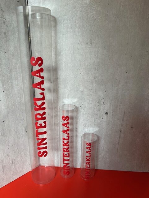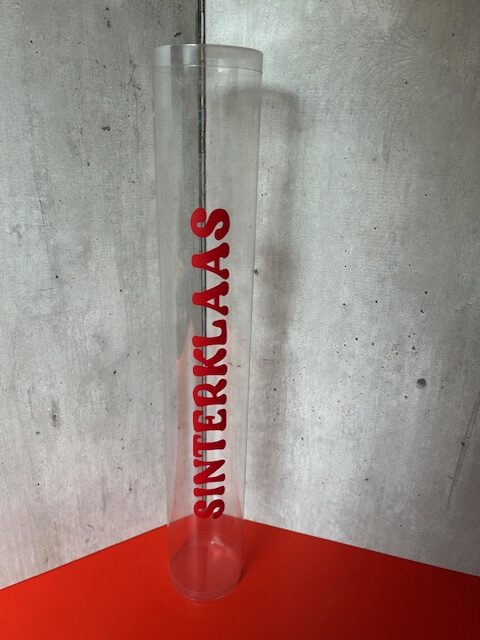 Een Lege snoepkoker met daarop de tekst ‘Sinterklaas’ in de kleur rood.