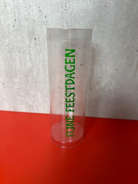 Een Lege snoepkoker met daarop de tekst ‘Fijne Feestdagen’ in de kleur groen.