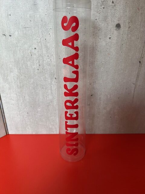 Een Lege snoepkoker met daarop de tekst ‘Sinterklaas’ in de kleur rood.
