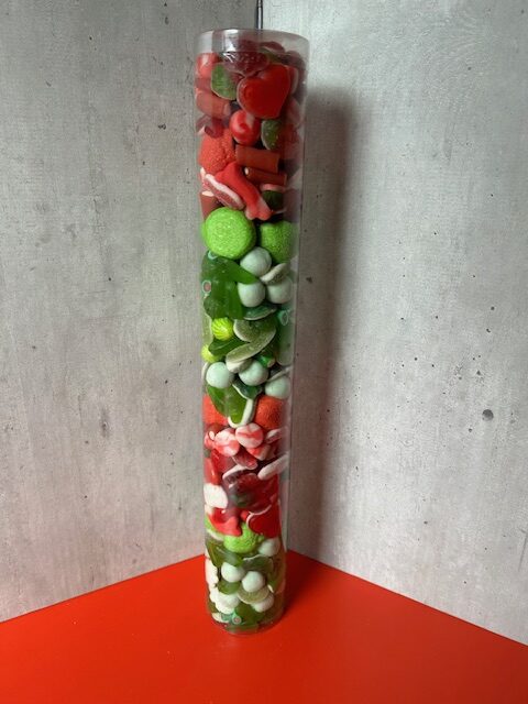 Een (transparante) snoepkoker gevuld met 4 lagen gemengd snoep in de kleuren rood en Groen (juiste foto volgt nog).