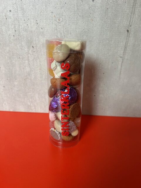 Een (transparante) snoepkoker gevuld met gemengd Sinterklaassnoep.