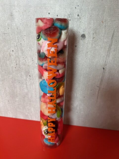 Een (transparante) snoepkoker gevuld met verschillende soorten Halloween snoep met de tekst halloween.
