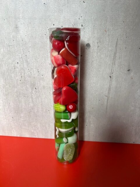 Een (transparante) snoepkoker gevuld met 2 lagen gemengd snoep in de kleuren rood en Groen.